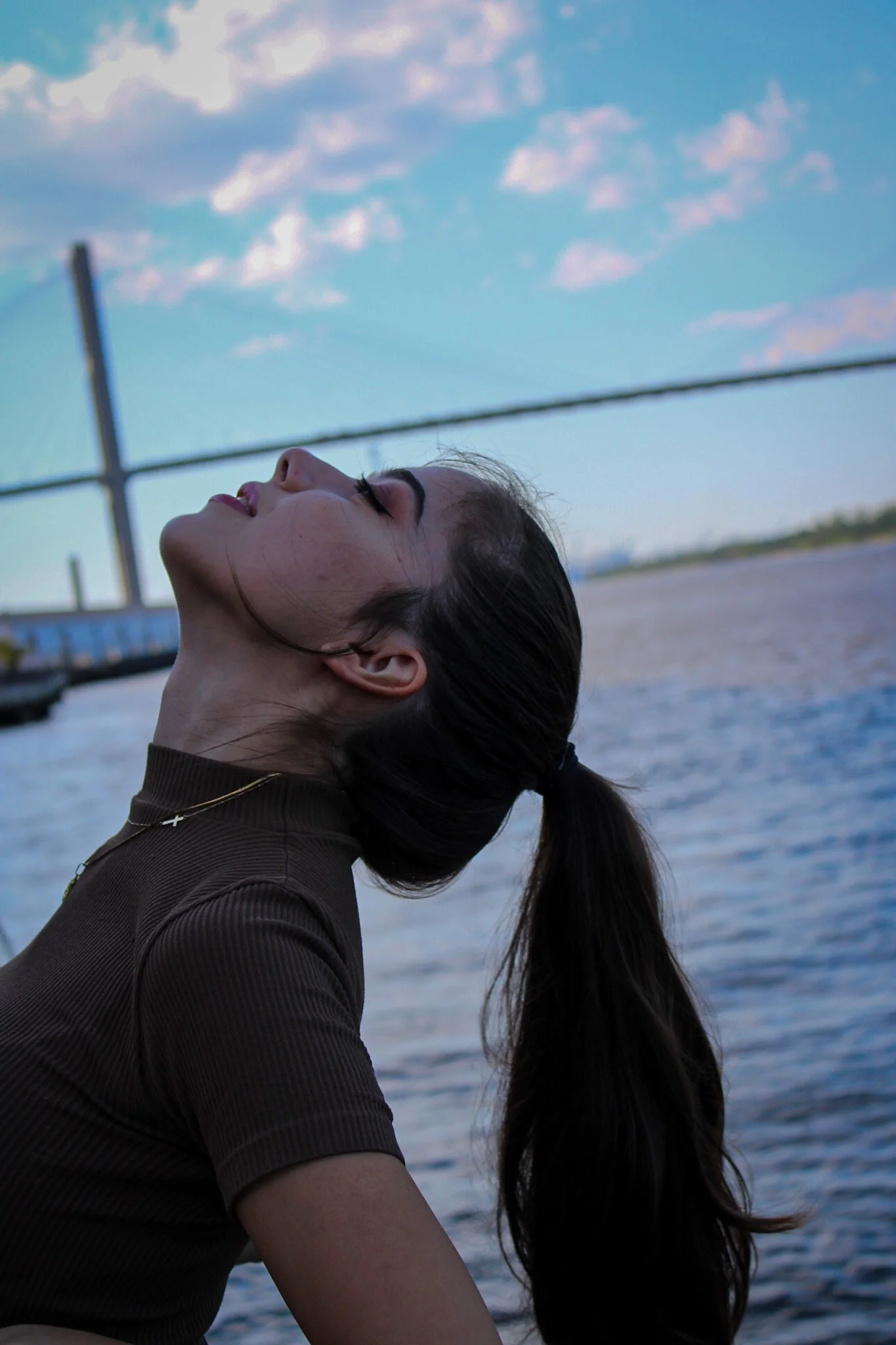 A woman with long dark hair tied in a ponytail, wearing a brown ribbed shirt and a gold necklace with a cross, is leaning her head back with her eyes closed, near a body of water with a blue sky and clouds in the background.