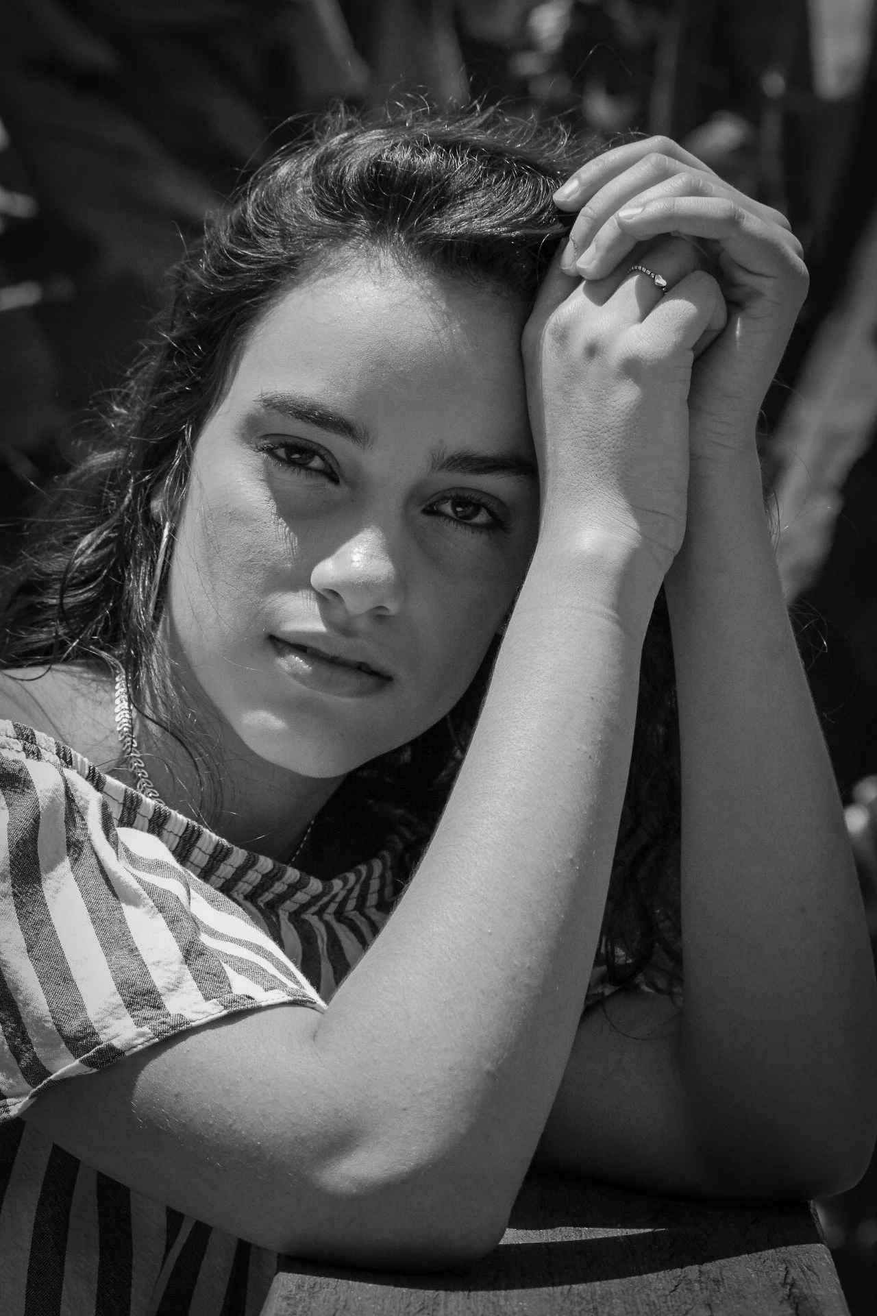 A young woman with dark hair, wearing a striped shirt and a necklace, rests her head on her crossed arms, looking into the camera. The photo is black and white.