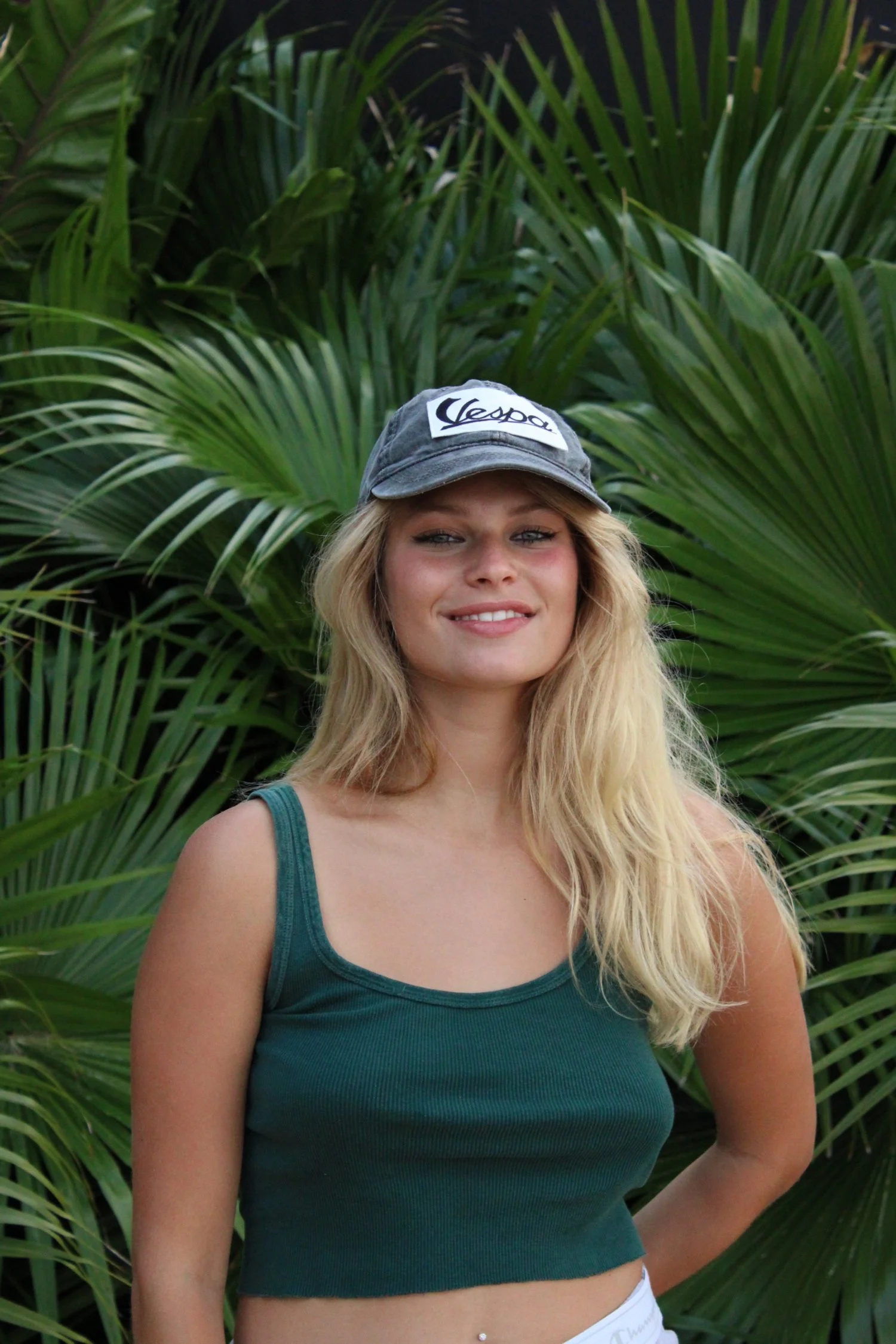 Young woman with long blonde hair wearing a green tank top, gray 'Vespa' cap, and white shorts standing in front of lush green palm leaves.