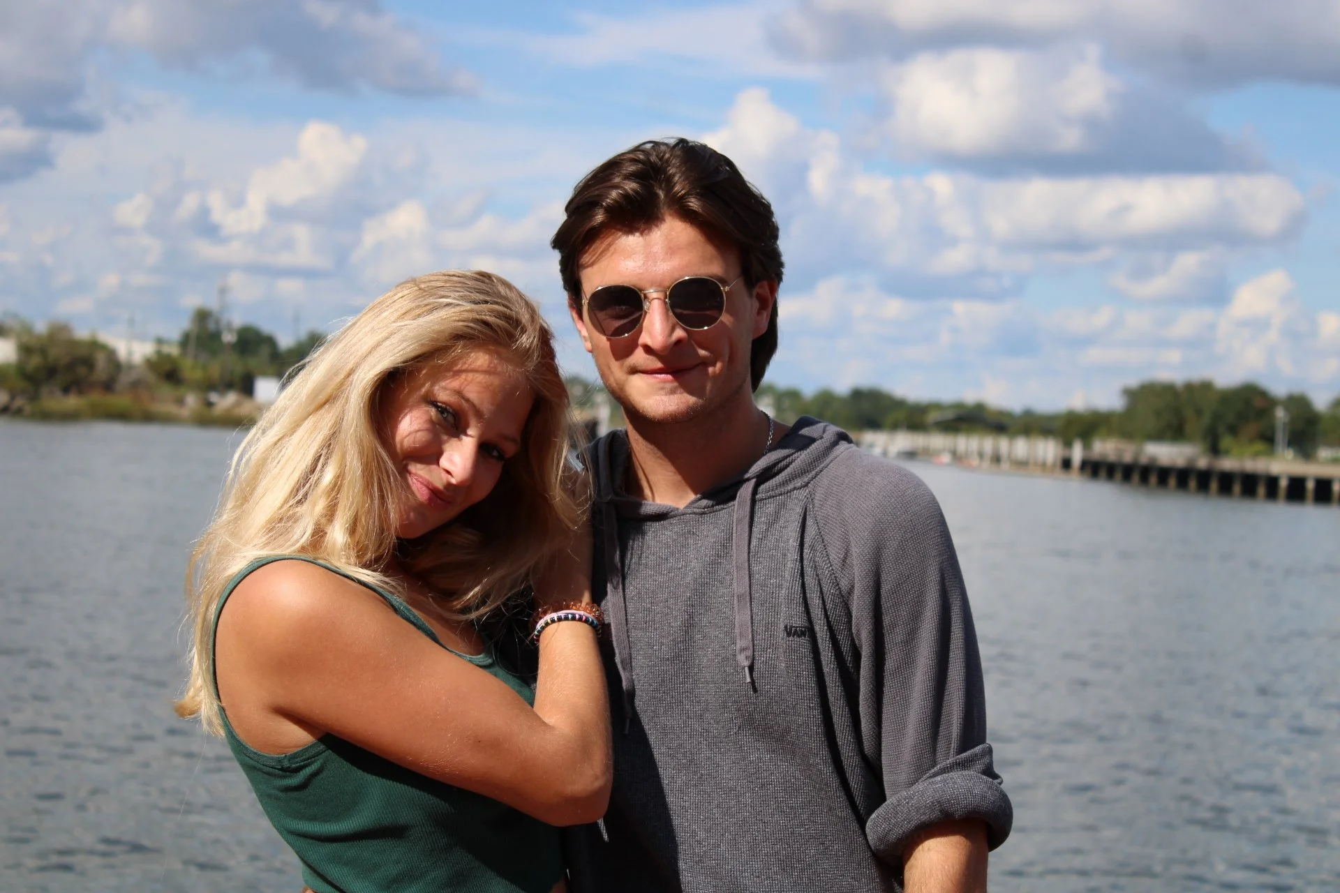 A young woman and a young man stand close together outdoors near a body of water, smiling at the camera on a partly cloudy day.