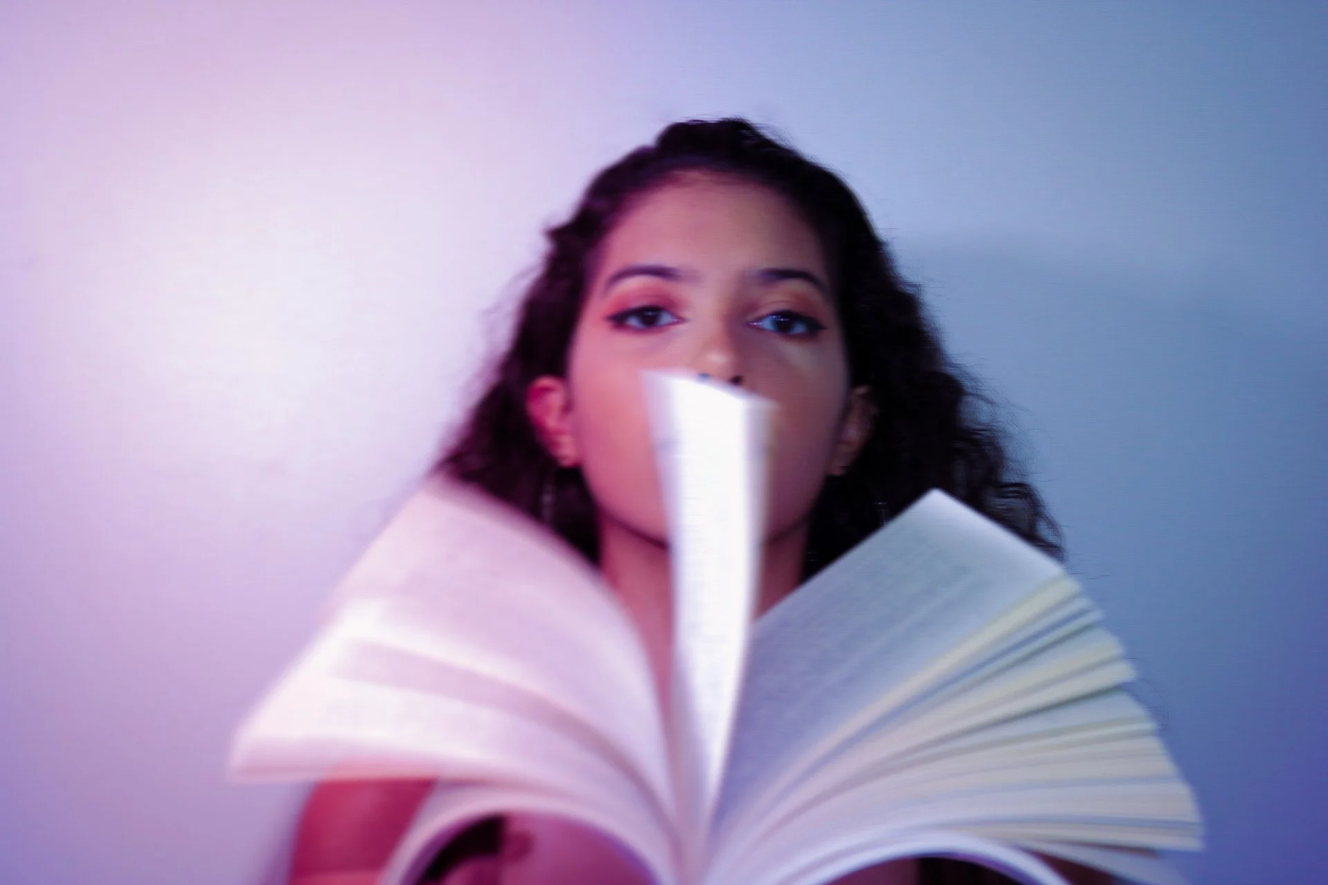 A woman with curly hair and makeup holding an open book, partially obscuring her face, against a blue and pink gradient background.